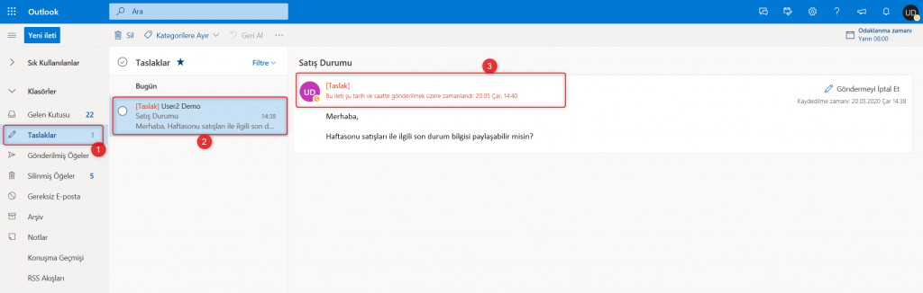 “Daha sonra gönder” ile ayarlanan mailer “Taslaklar” bölümünde görüntülenir. Taslak bölümünde yer alan mail içerisinde ilgili iletinin zamanlandığı tarih ve saat bilgisinin yer aldığı uyarı metni görüntülenir. İlgili mail zamanı geldiğinde ilgili kullanıcıya iletilir.